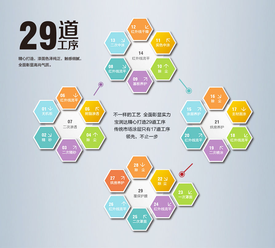 色彩統(tǒng)一 寶潤達擁有系統(tǒng)化的色彩控制方案 完美的原材料供應(yīng)保障 40噸單缸產(chǎn)能 專業(yè)化的產(chǎn)品涂裝技術(shù) |